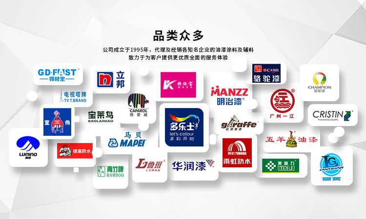公司成立于1995年,代理及经销各知名企业的油漆涂料,包括ICI多乐士、明治漆、立邦漆、东方雨虹、长颈鹿、鲸海、青竹克里斯汀骆驼漆、涂耐可、紫荆花漆油等。